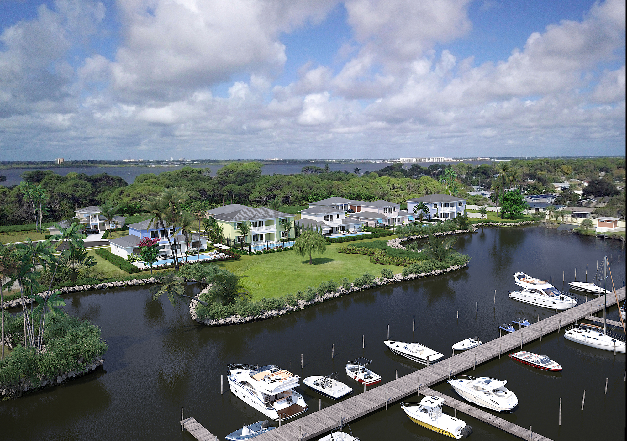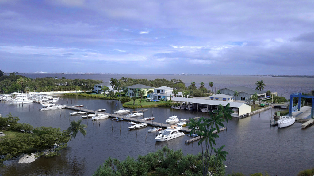 Slide the middle arrow side to side to see a before and after of this Miami Condo drone rendering. In the “before” image, you will notice the gray area, or clay model, of the condo building. Our Artistic & Technological Developer digitally modeled this area directly within his drone footage of the original empty lot on this Miami Island. Therefore, everything outside of this gray area is in fact the real image that was taken from the drone’s camera. The “after” image shows the completed CGI Drone Integrated 3D Rendering.