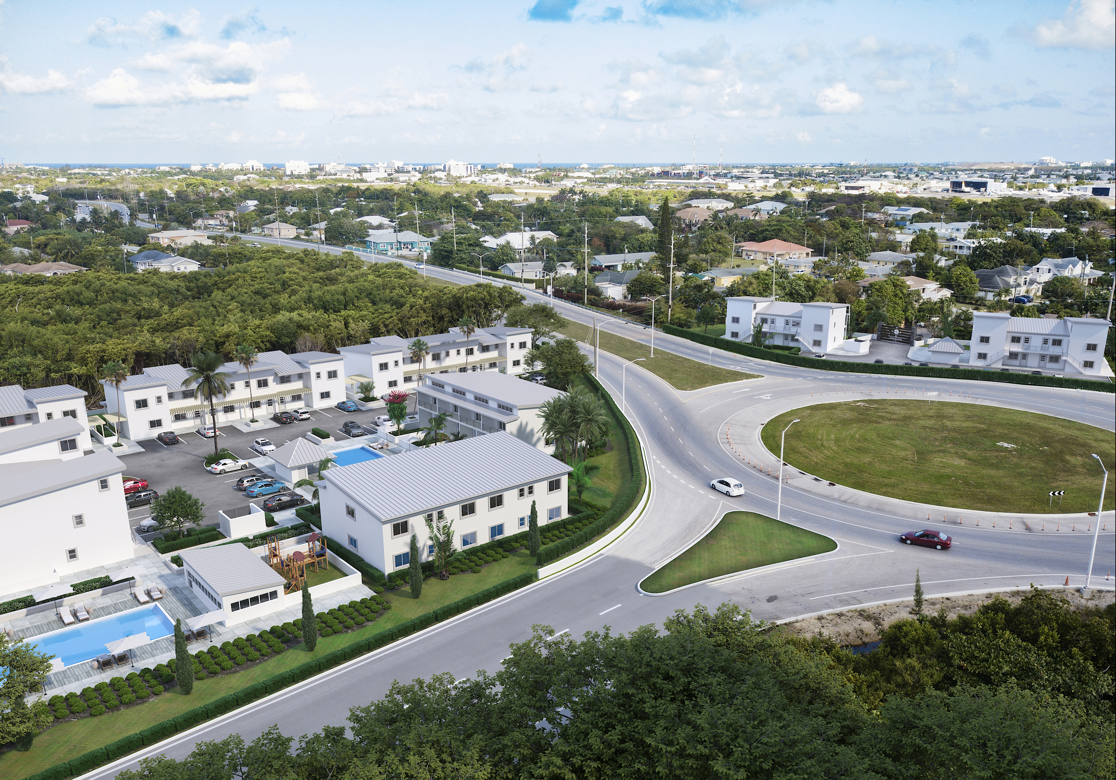 The above drone integrated rendering is a part of a larger mixed-use project that includes single family units, office space, retail space & more. The addition of this green farmers market, showing the proximity to the building and a major intersection as well, gives the project a sense of placemaking & lifestyle.