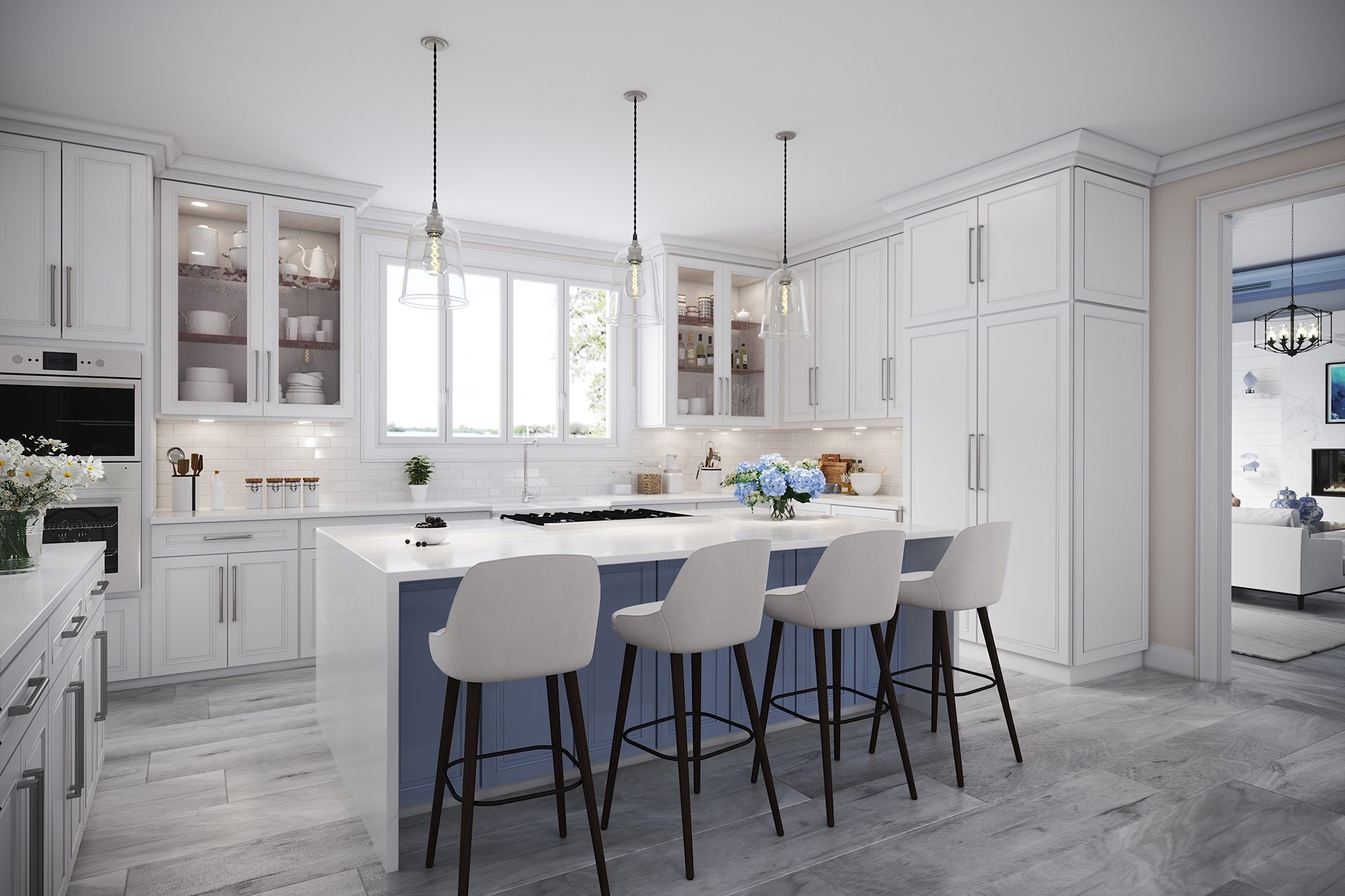 This kitchen renovation rendering was requested for marketing purposes for our real estate client to show potential updates to a listed home. Being that it is a riverfront home, our client requested more of a coastal elegance to lighten up the place from its original dark stone detailing. Changes included, but were not limited to: flooring, removal of the hood, cabinet style, color, counter tops, and waterfall island changes.
